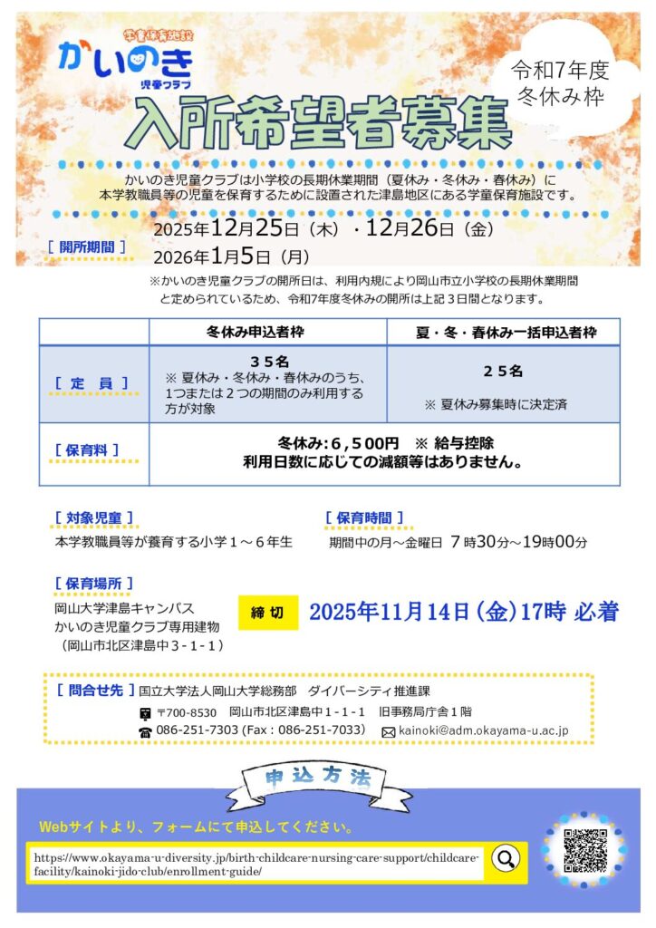 岡山大学かいのき児童クラブ 令和7年度冬休み募集要項(学内)