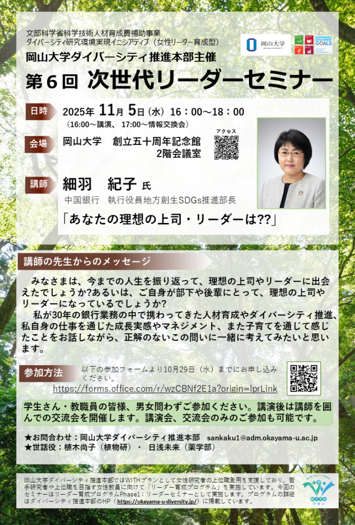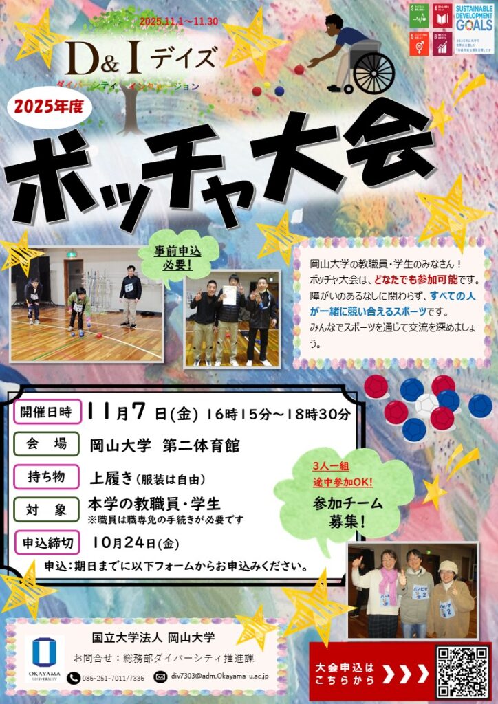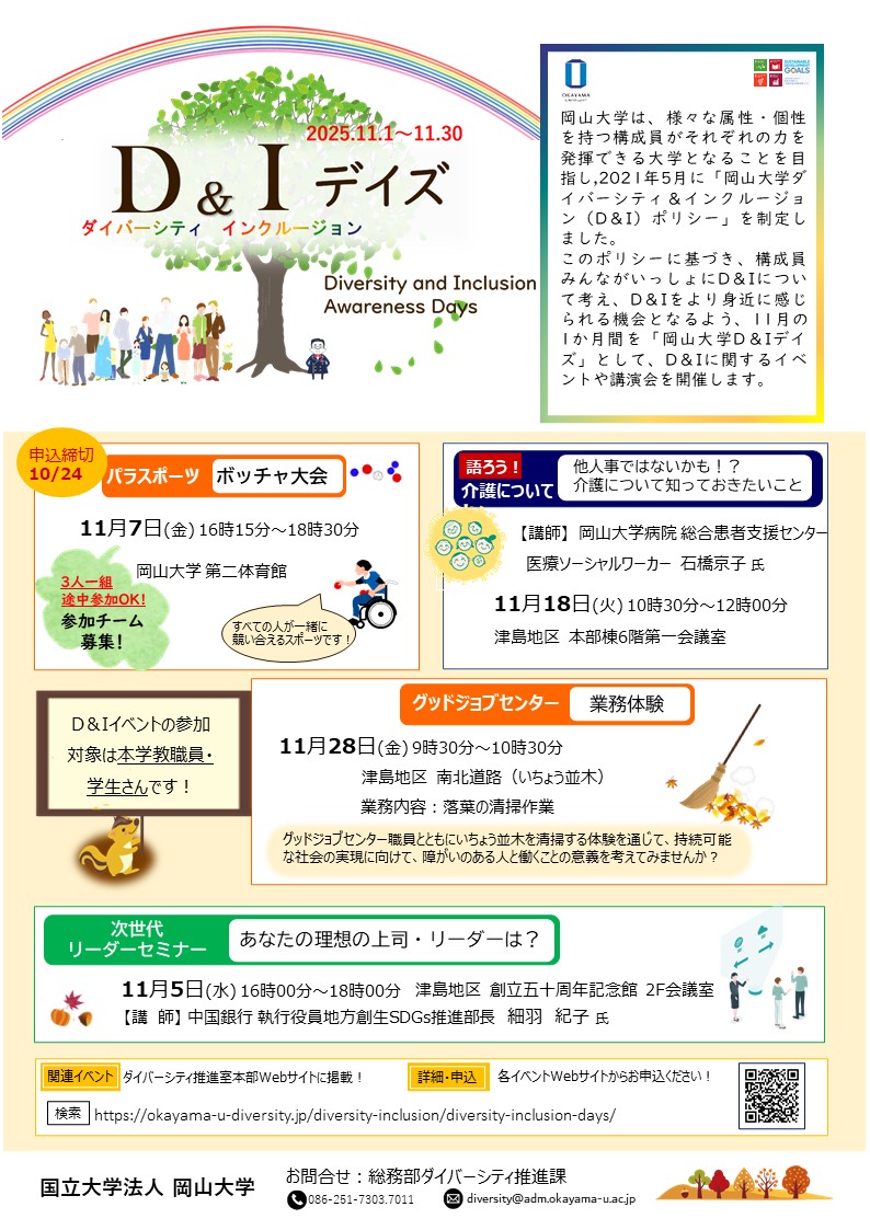 岡山大学におけるダイバーシティ&インクルージョン(D&I)をさらに推進するため、11月の1か月間を「ダイバーシティ&インクルージョンデイズ/ Diversity and Inclusion Awareness Days」として、D&Iに関する取り組みや情報を広く紹介します。