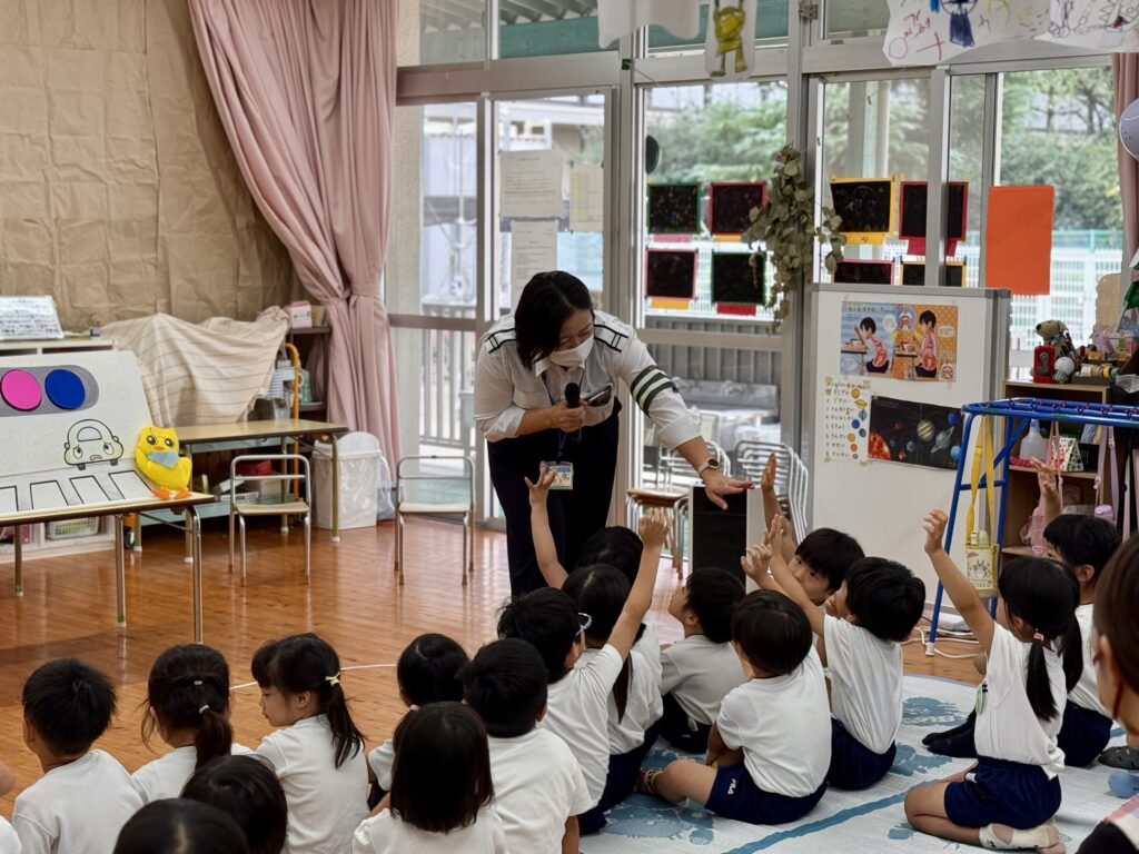 10月14日、なかよし園の3~5歳の園児たち約30人が、岡山市生活安全課の交通指導員さんと一緒に交通安全について楽しく学びました!👧👦