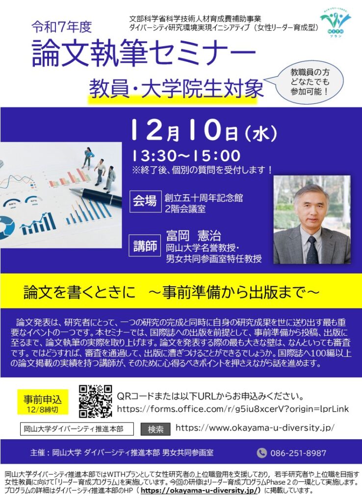 岡山大学ダイバーシティ推進本部ではWITHプランとして女性研究者の上位職登用を支援しており,若手研究者や上位職を目指す女性教員に向けて「リーダー育成プログラム」を実施しています。今回の研修はリーダー育成プログラムPhase2の一環として実施します。プログラムの詳細はダイバーシティ推進本部のHP( https://okayama-u-diversity.jp/)に掲載しています