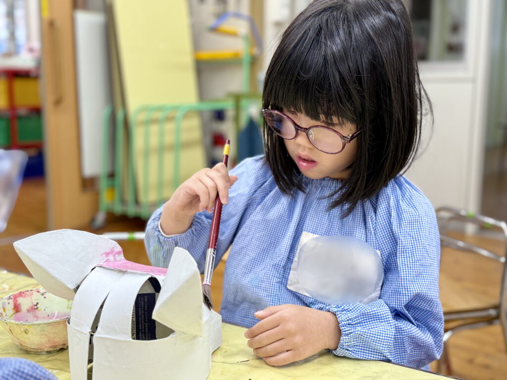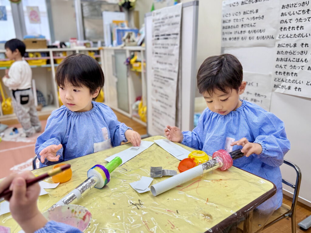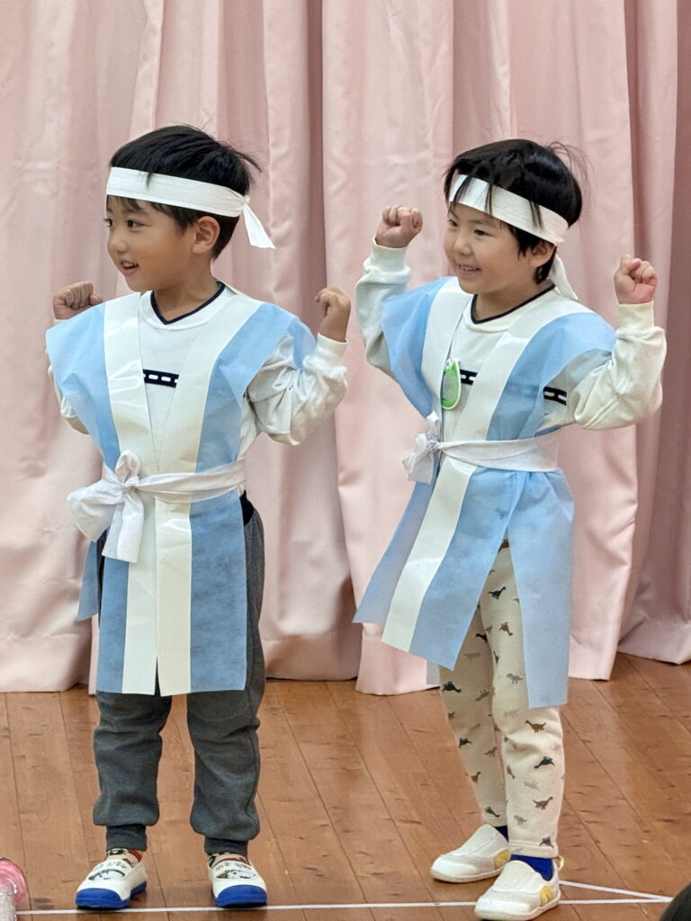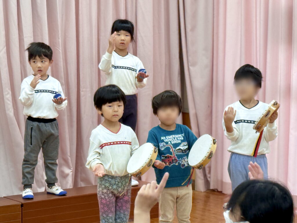 小さな手でぎゅっと握りしめた小道具やかぶっている動物のお面🐶🐵🐦は、発表会のためにみんなが考えて手作りしました🎨