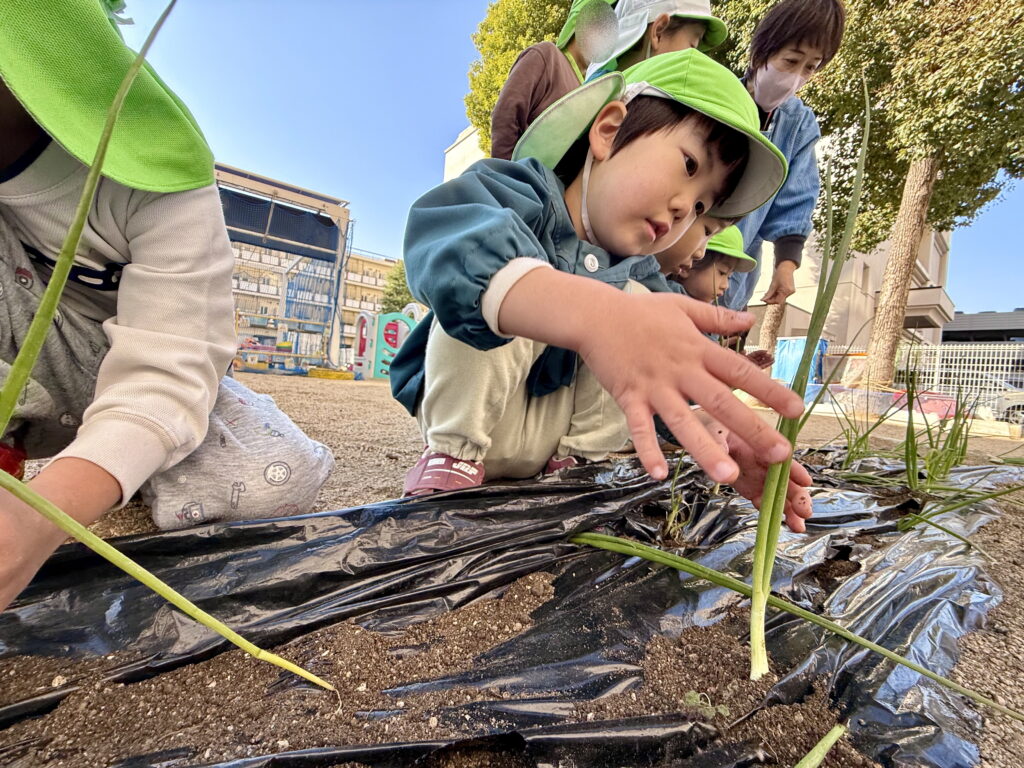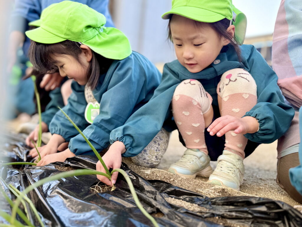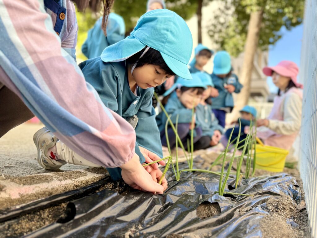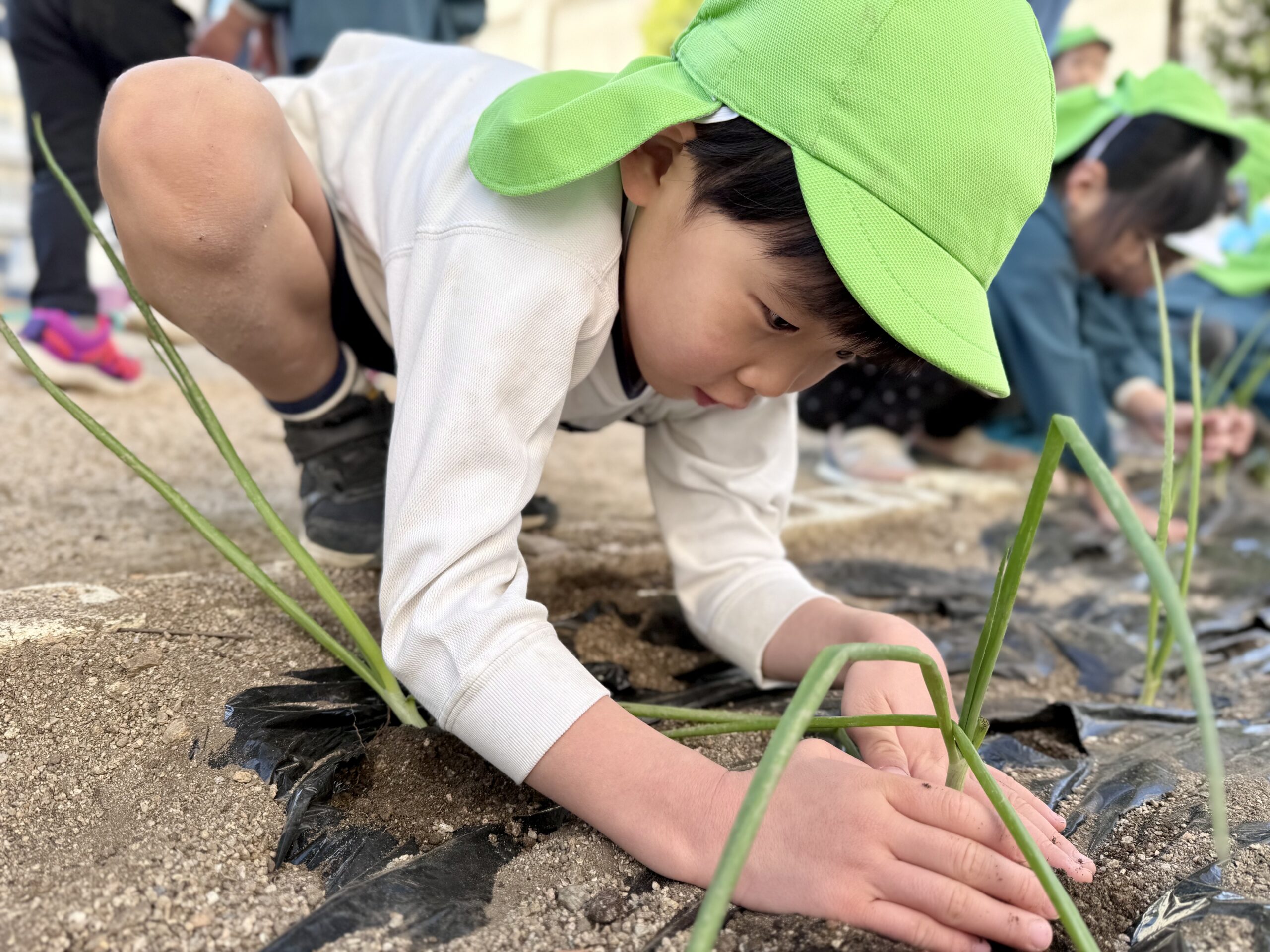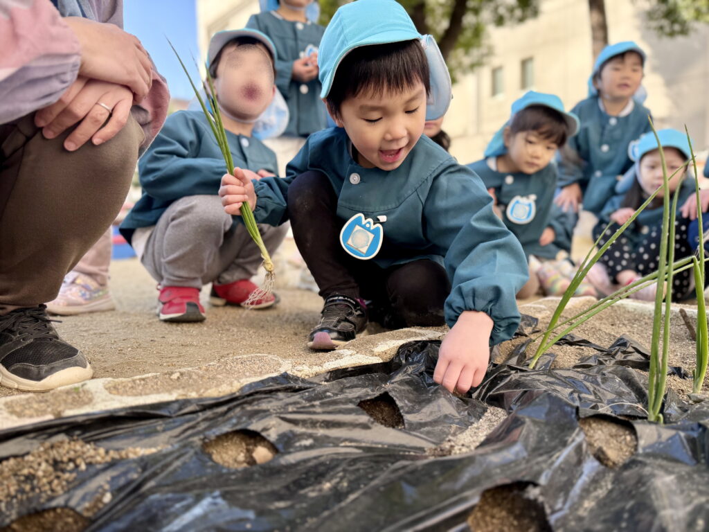 ぽかぽかとした土のにおいが広がる園庭の畑で、ぞう組さん🐘ときみどりらいおん組さん🦁が、玉ねぎの苗植えに挑戦しました💪