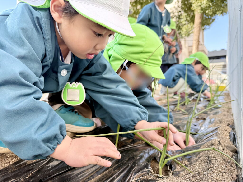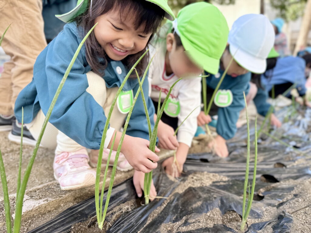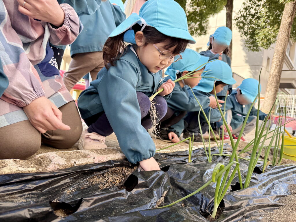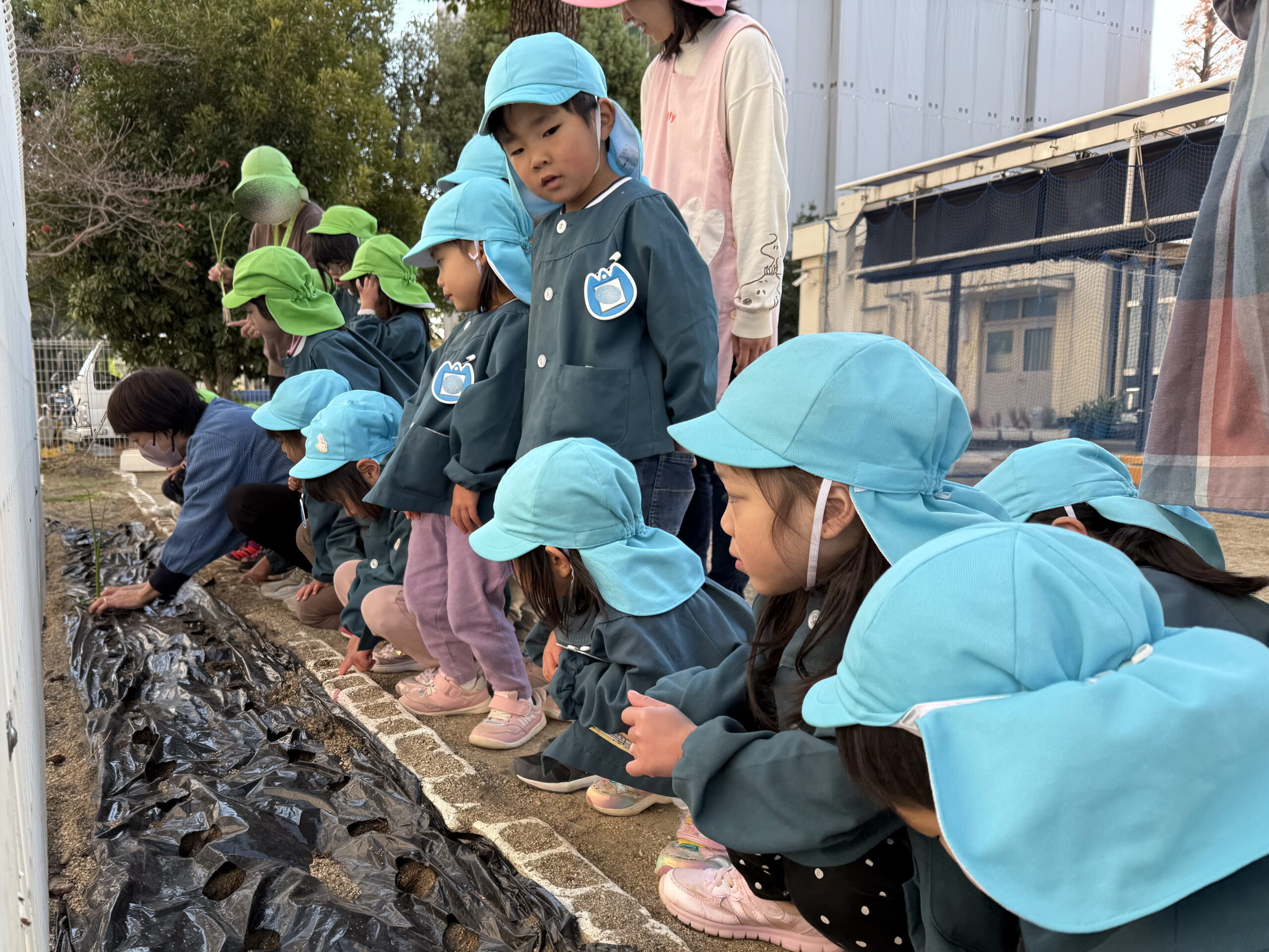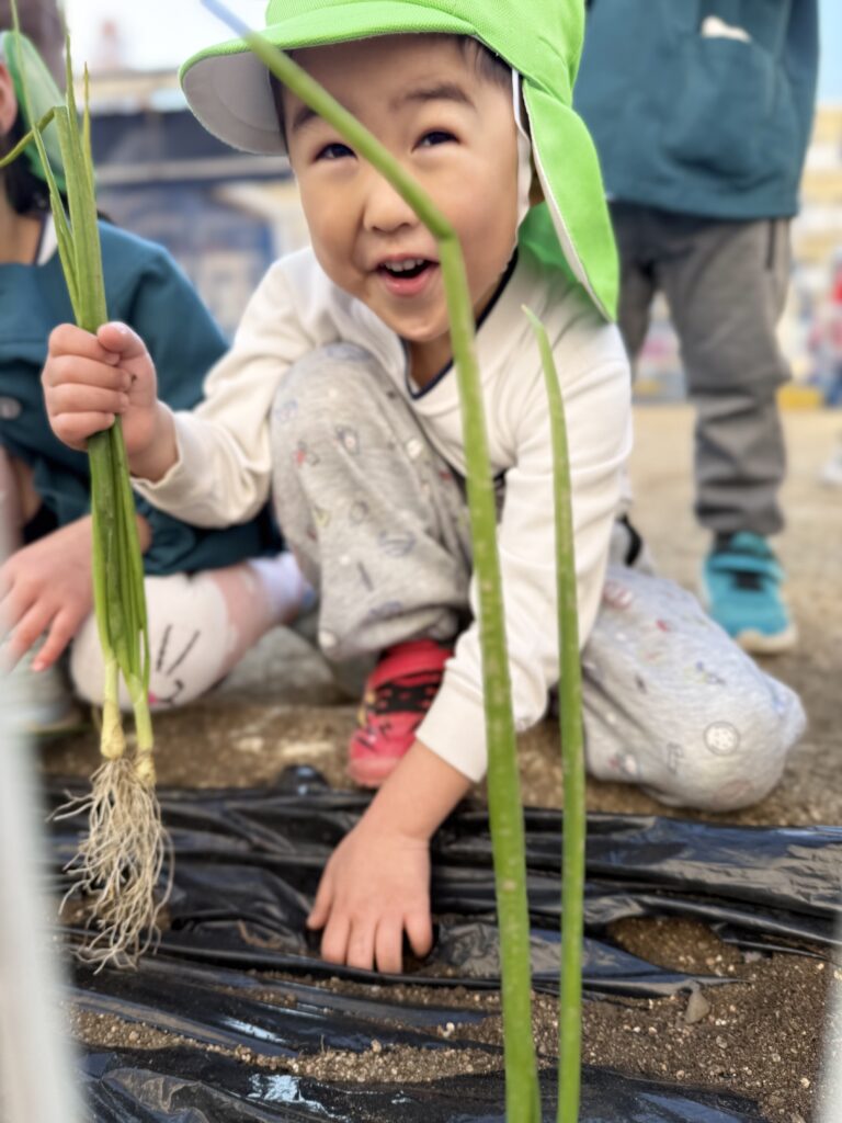 ぽかぽかとした土のにおいが広がる園庭の畑で、ぞう組さん🐘ときみどりらいおん組さん🦁が、玉ねぎの苗植えに挑戦しました💪