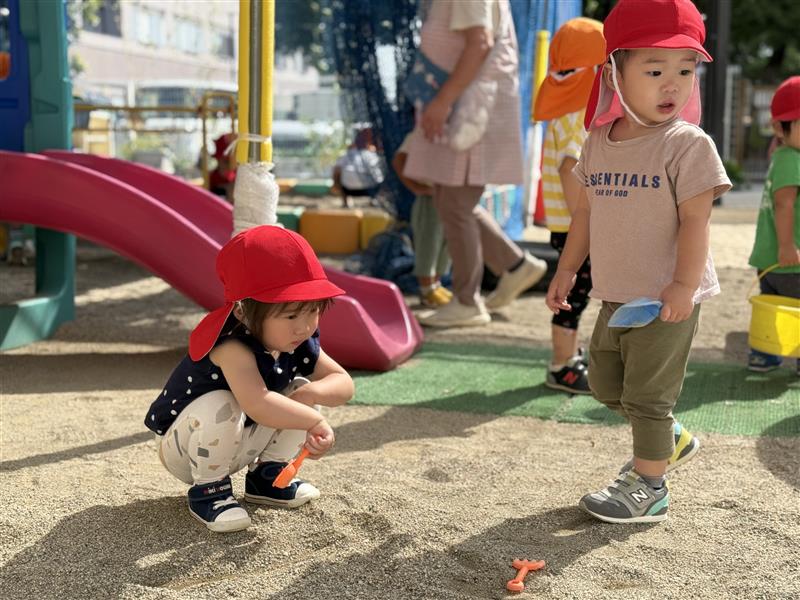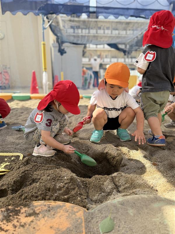りす組さんうさぎ組さんで、協力して砂場に大きな穴を掘ることができました!⛱️⛱️⛱️